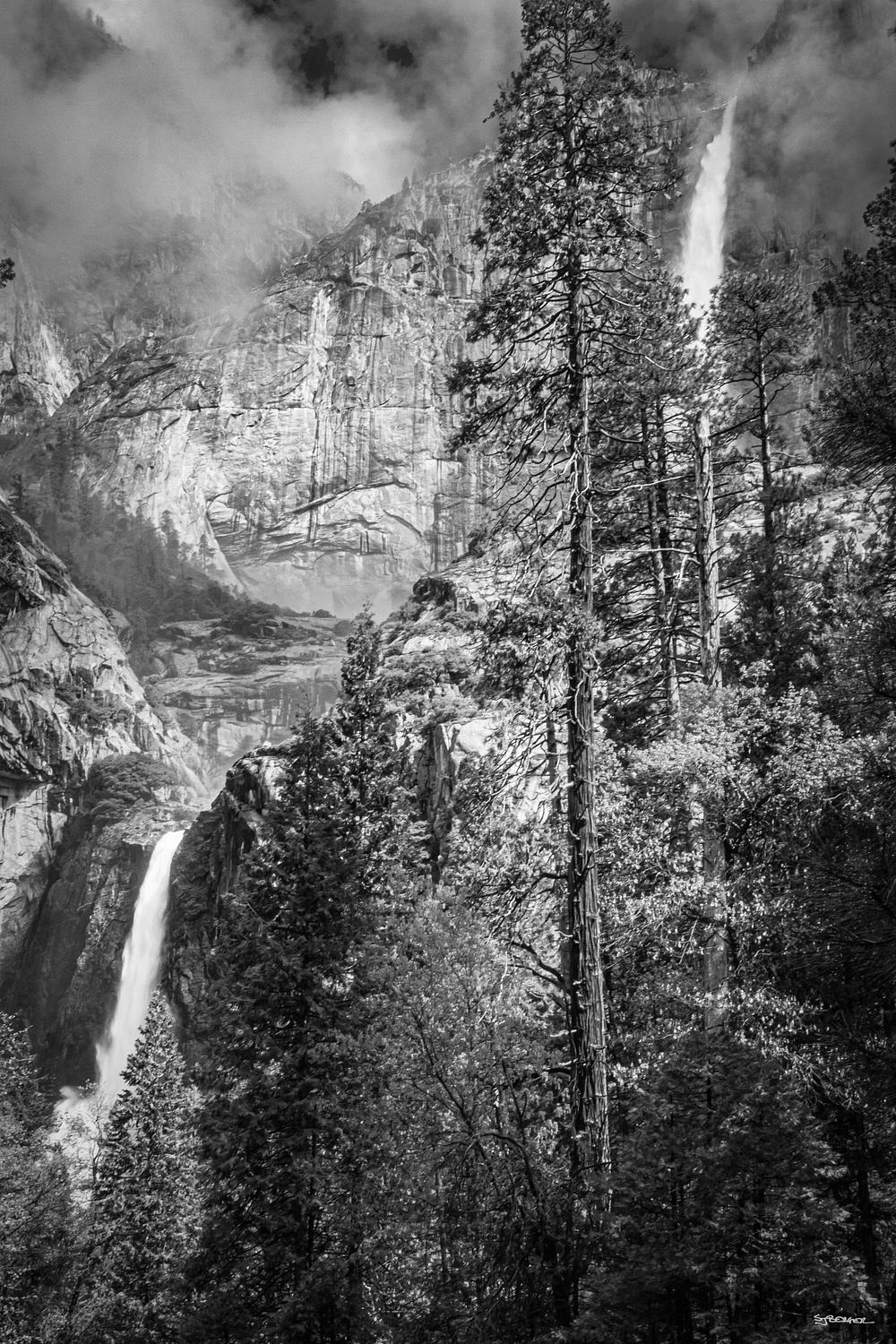 Upper and Lower Yosemite Falls in Black and White. Yosemite National Park, California